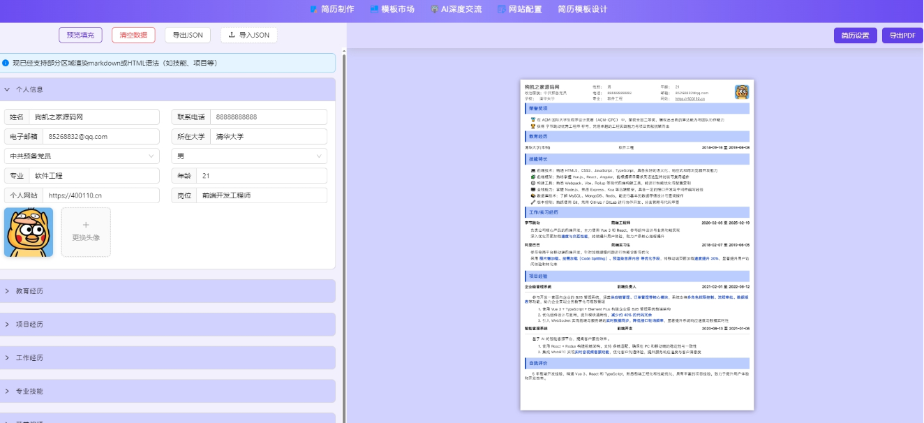 - 数据操作:提供导出 / 导入简历数据、清空数据、预填充示例数据以及一键填充虚假数据(用于快速查看简历效果)等功能。